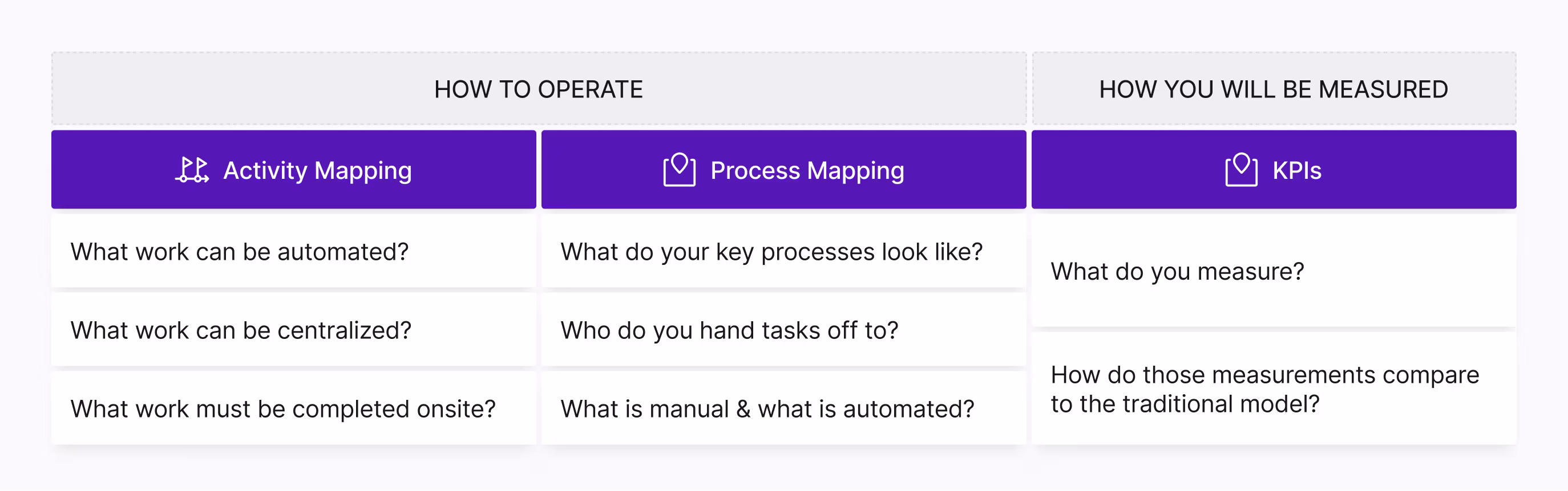 In a centralized model, measuring individual performance misses the point. Success comes from how well your three teams—AI, centralized specialists, and onsite staff—work together. You have to adjust your KPIs to reflect this reality. Here’s the four buckets we recommend grouping them into: