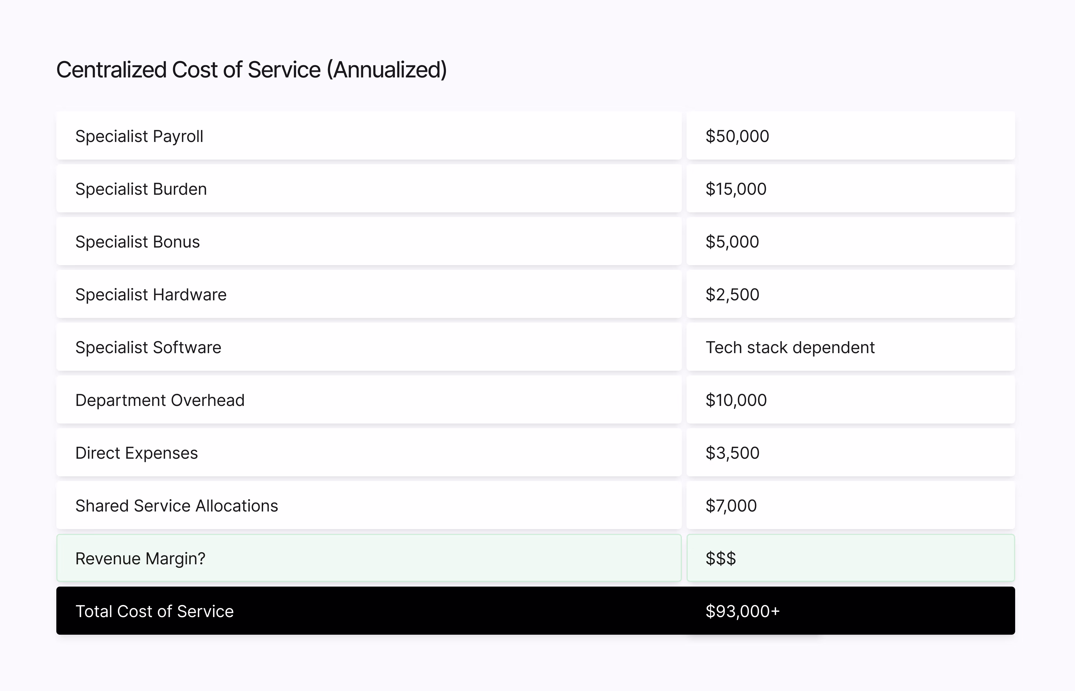 Before setting billing rates, operators must calculate the complete cost structure of their centralized services. This goes well beyond just payroll. The full cost of service includes: