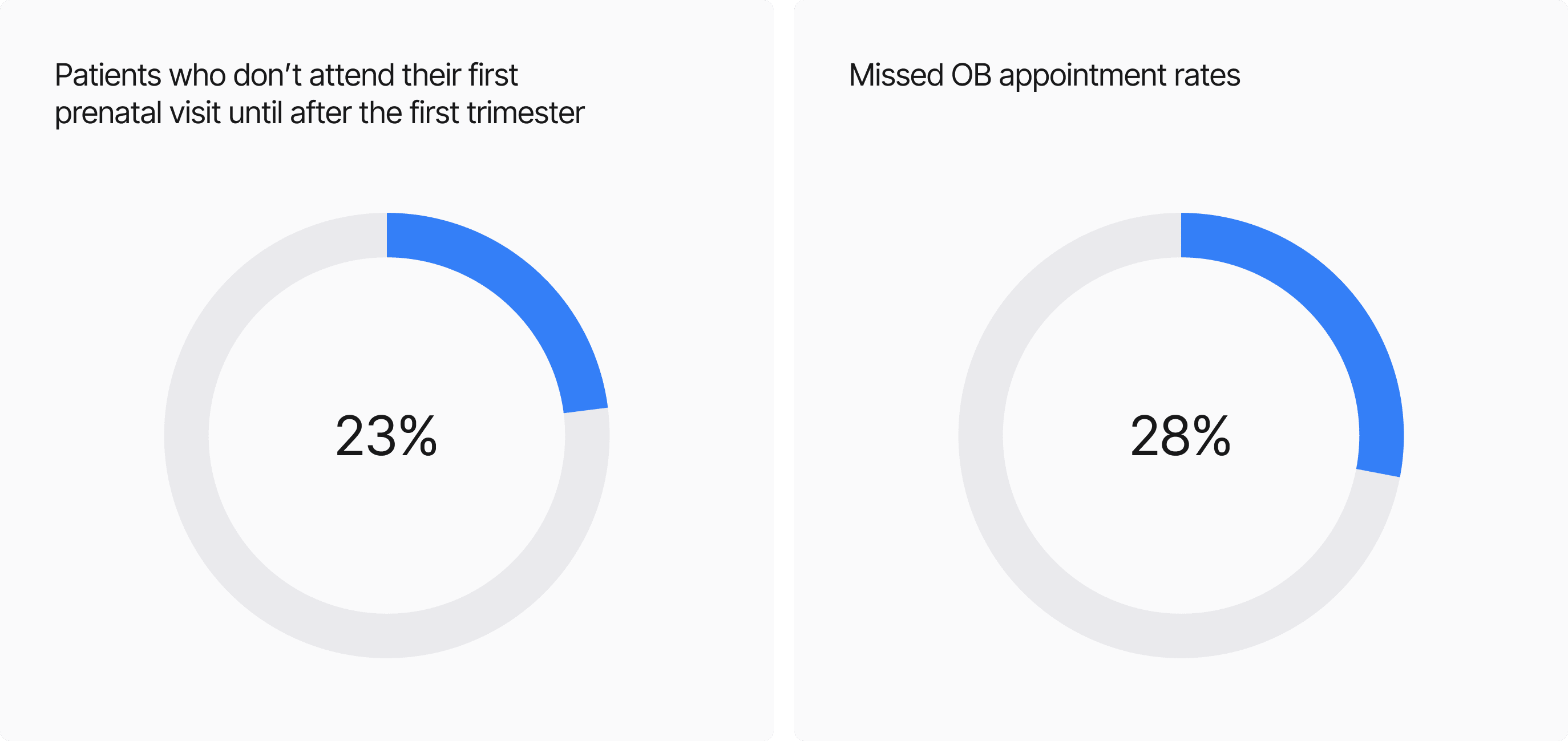 According to ACOG, 23% of patients don't attend their first prenatal appointment until after the first trimester, and nearly half don't receive all recommended services on time. Research published in PubMed has documented missed OB appointment rates as high as 28% in clinics serving lower-income populations.