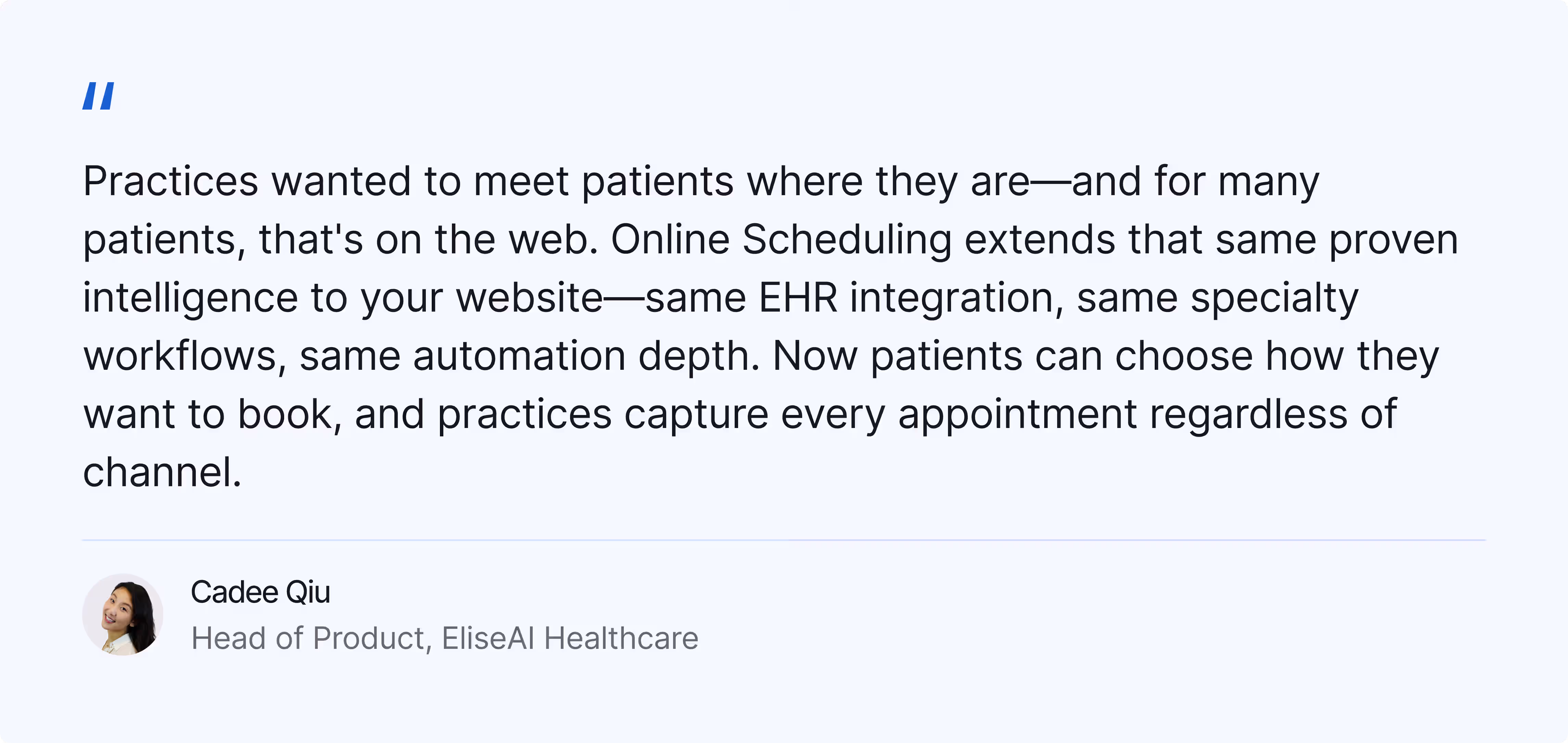 “Practices wanted to meet patients where they are—and for many patients, that's on the web. Online Scheduling extends that same proven intelligence to your website—same EHR integration, same specialty workflows, same automation depth. Now patients can choose how they want to book, and practices capture every appointment regardless of channel."