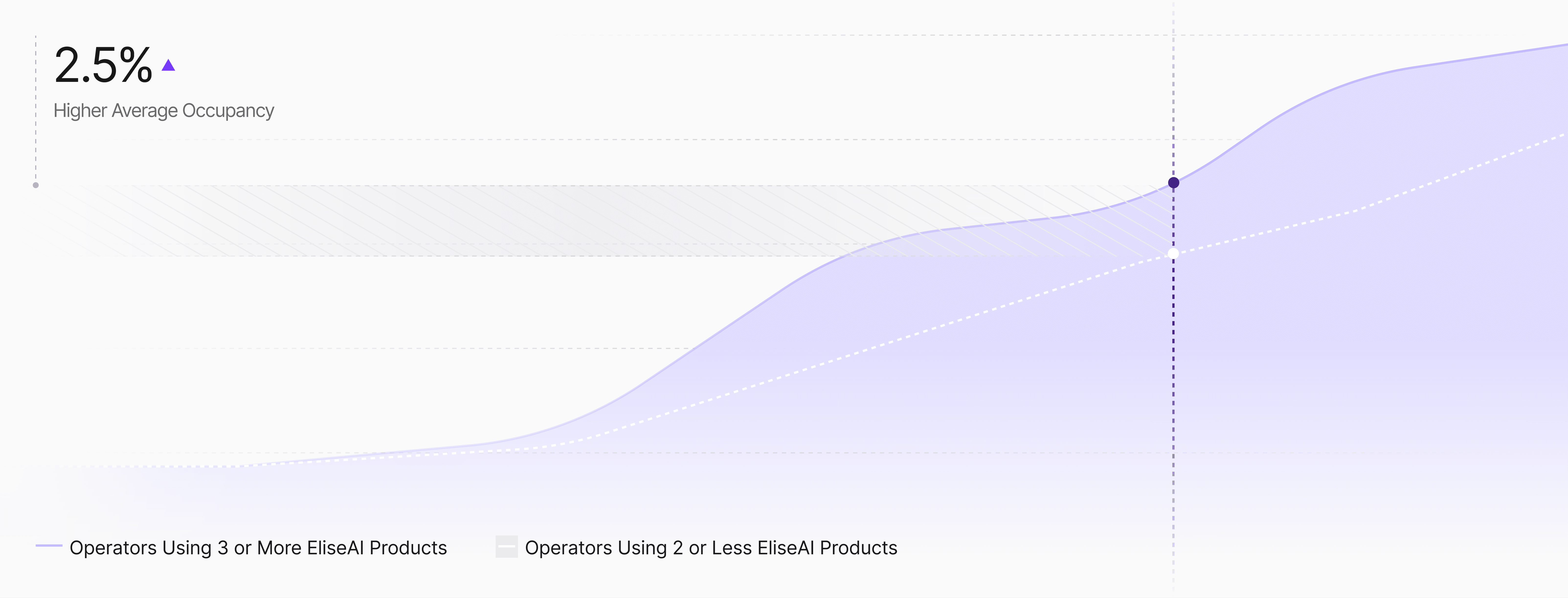 Our analysis of a sample of EliseAI customers using varying amounts of EliseAI solutions crystalizes the divide between the operators who are truly embracing a “one AI”-centered management model, and those who aren’t. On average, across the millions of units live on EliseAI products, operators who leverage 3 or more EliseAI products realize 2.5 percentage point higher occupancy rates. But the synergistic gains don’t end there.