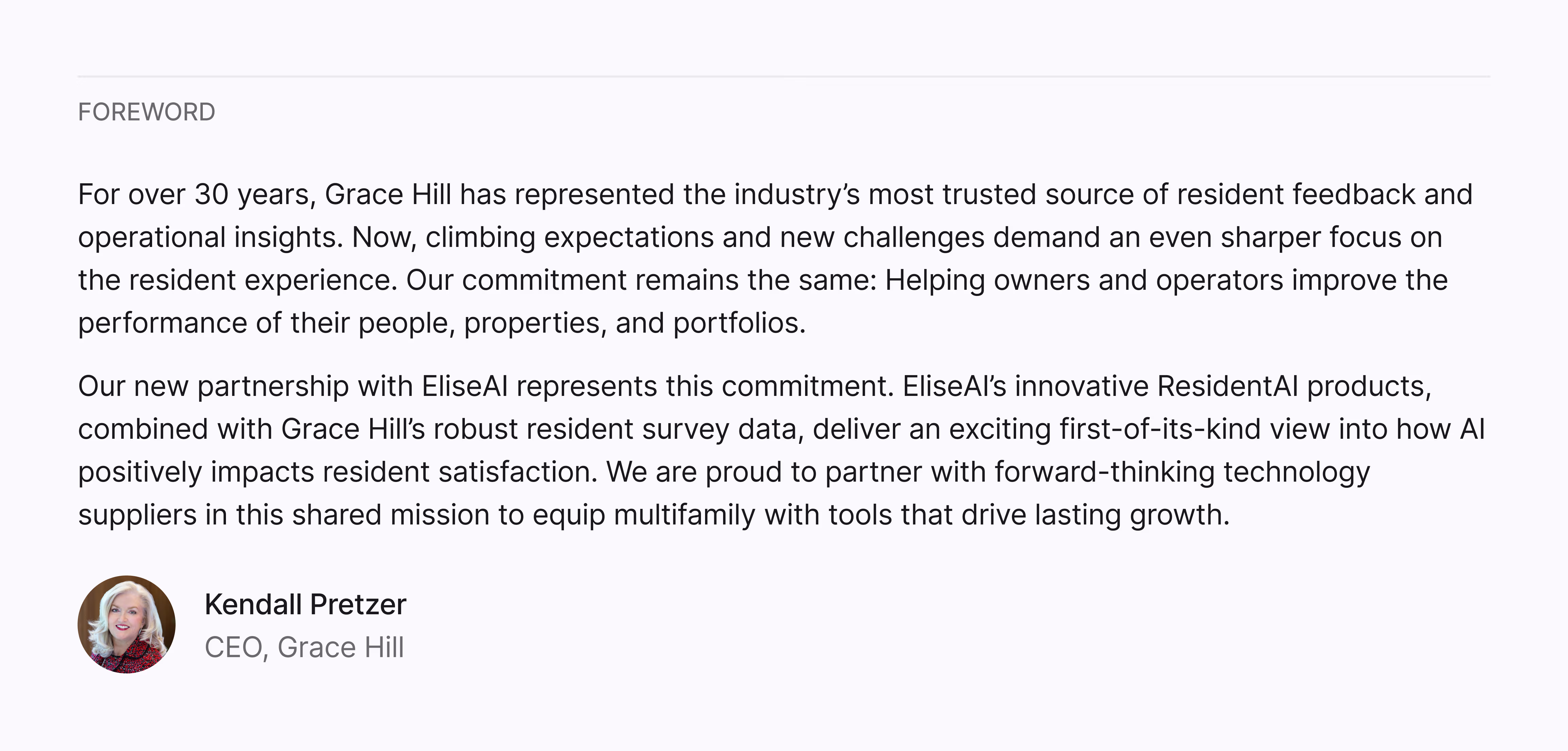 Today, over 600 multifamily, student, and affordable housing operators across the country rely on EliseAI to automate communications and workflows throughout the full prospect-through-resident lifecycle, creating new efficiencies that improve responsiveness to residents, accelerate leasing velocity, and lower costs. We’ve quantified the impact of EliseAI on occupancy rates before—ALN Apartment Data shows that EliseAI-enabled communities achieve a +2% occupancy rate delta against their non-EliseAI-enabled comps—but we’ve stopped short of measuring the impact of EliseAI on overall resident satisfaction levels. That is, until now.