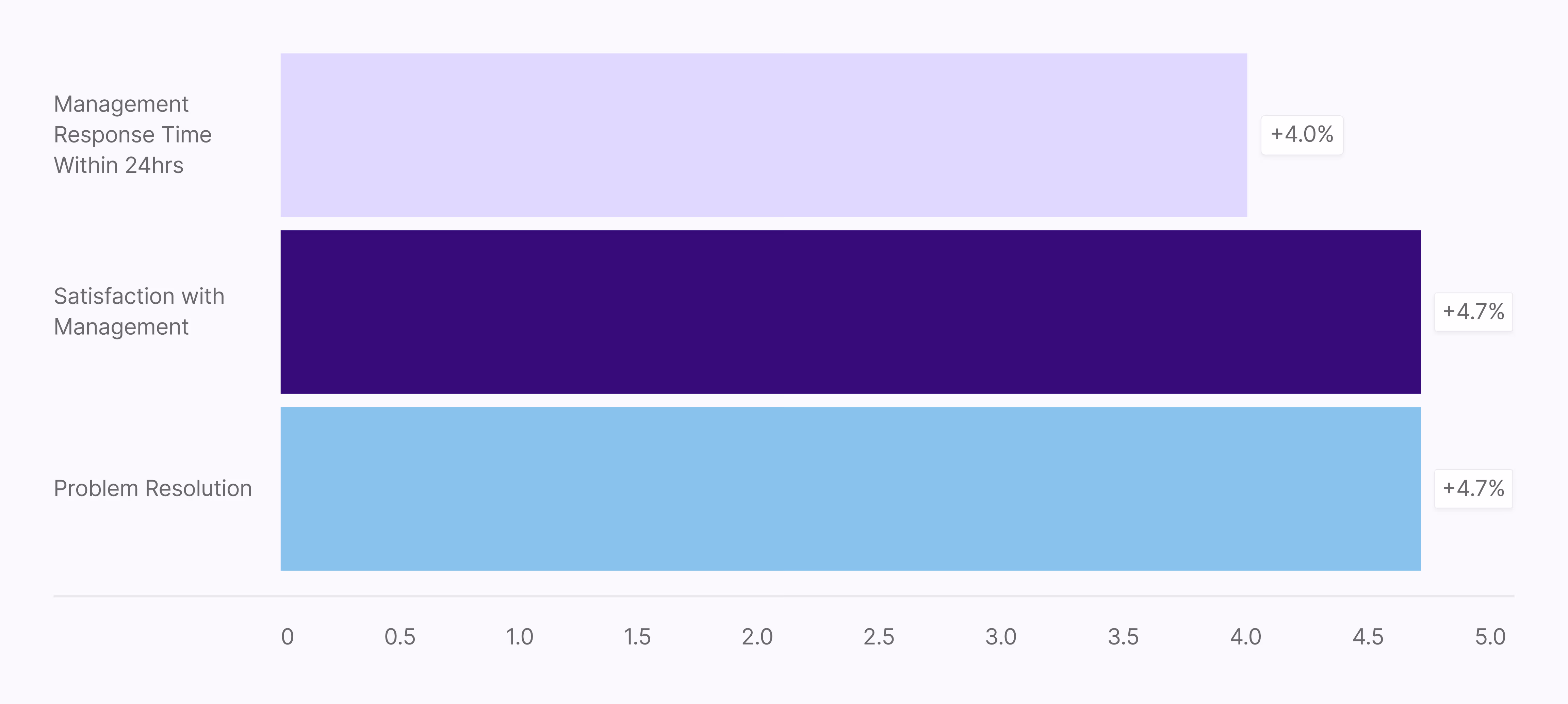 The impact of EliseAI’s Maintenance tool on resident engagement and satisfaction levels also extends to the way residents feel about their management companies at large, a key finding that quantifies EliseAI’s contribution to elevated renewal rates. Operators leveraging the Maintenance product realize a +4% score increase in responsiveness levels, with automated AI-powered follow-up messages keeping residents in the loop at all times. This responsiveness is translated to a 4.7% delta for overall satisfaction with management—a massive swing that can have a meaningful impact on NOI.