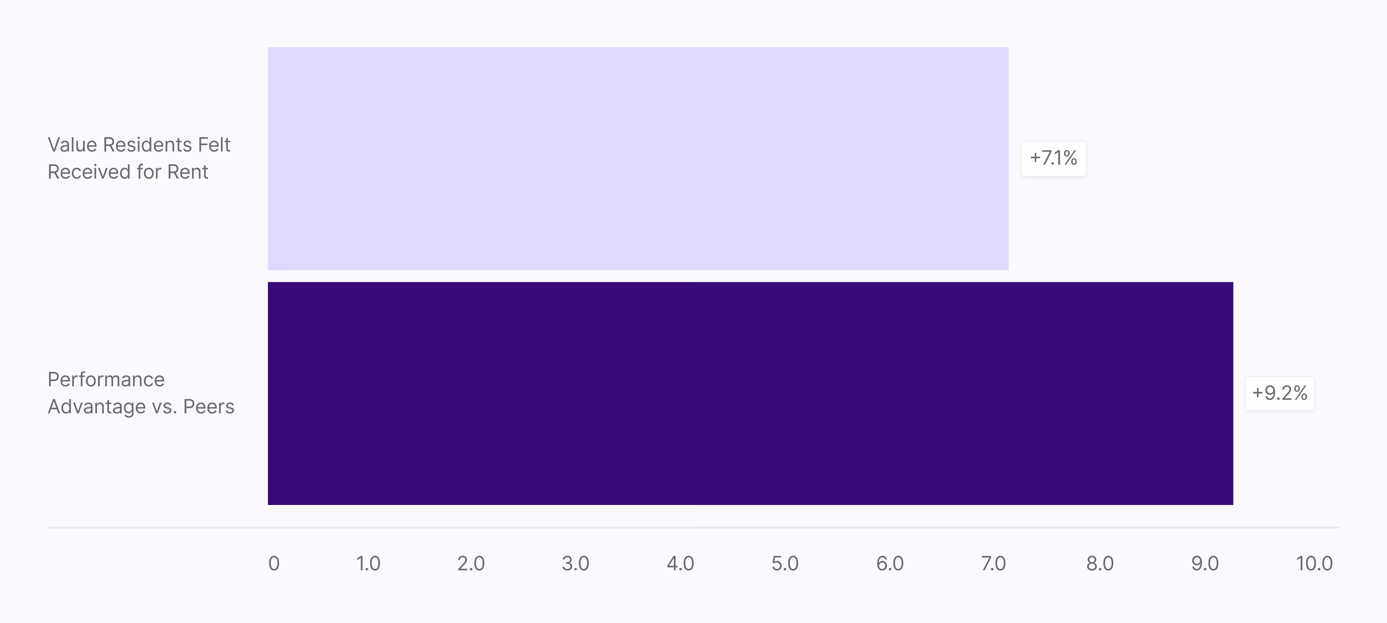 Communities leveraging EliseAI’s Maintenance product saw concrete impacts on more generalized resident sentiment areas, with two key focus areas of note: perceived value received for rent and performance advantage vs. comparable communities in the area. For one, operators who implemented EliseAI’s Maintenance product boosted residents’ perceived value received for rent by 7.1%, demonstrating that responsiveness directly translates to how residents view their living arrangements from a financial perspective. In a time of compressed NOI and flattening rents in high-supply areas, ensuring your residents feel they’re receiving value for what they pay is absolutely crucial in order to boost renewal rates and protect revenue.