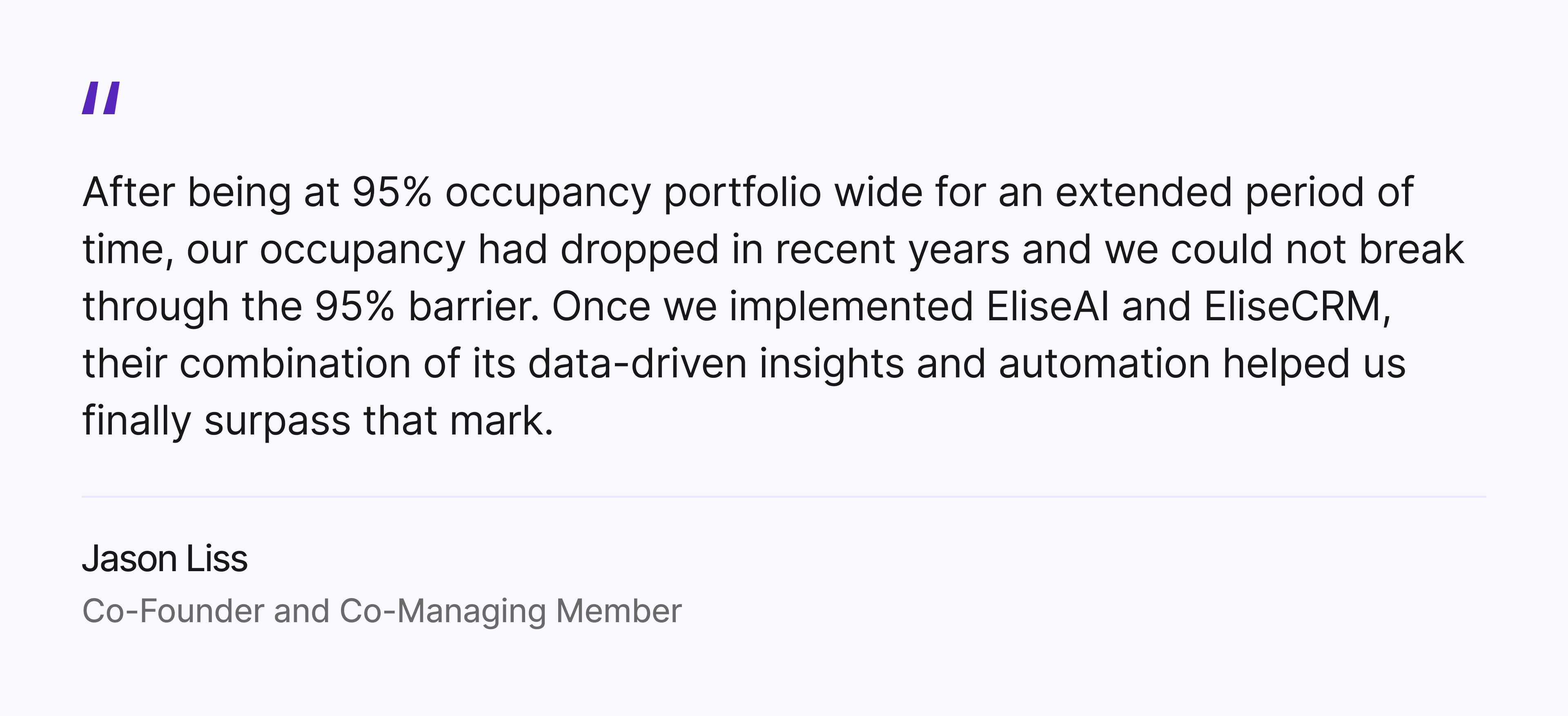 After being stuck hovering around 90% occupancy for years, Liss Property Group saw their rates jump several percentage points, finally achieving the 95% target that had eluded them for so long. This improvement directly resulted from the operational changes they made based on EliseCRM insights, changes they simply couldn't have made without understanding where their processes were breaking down.