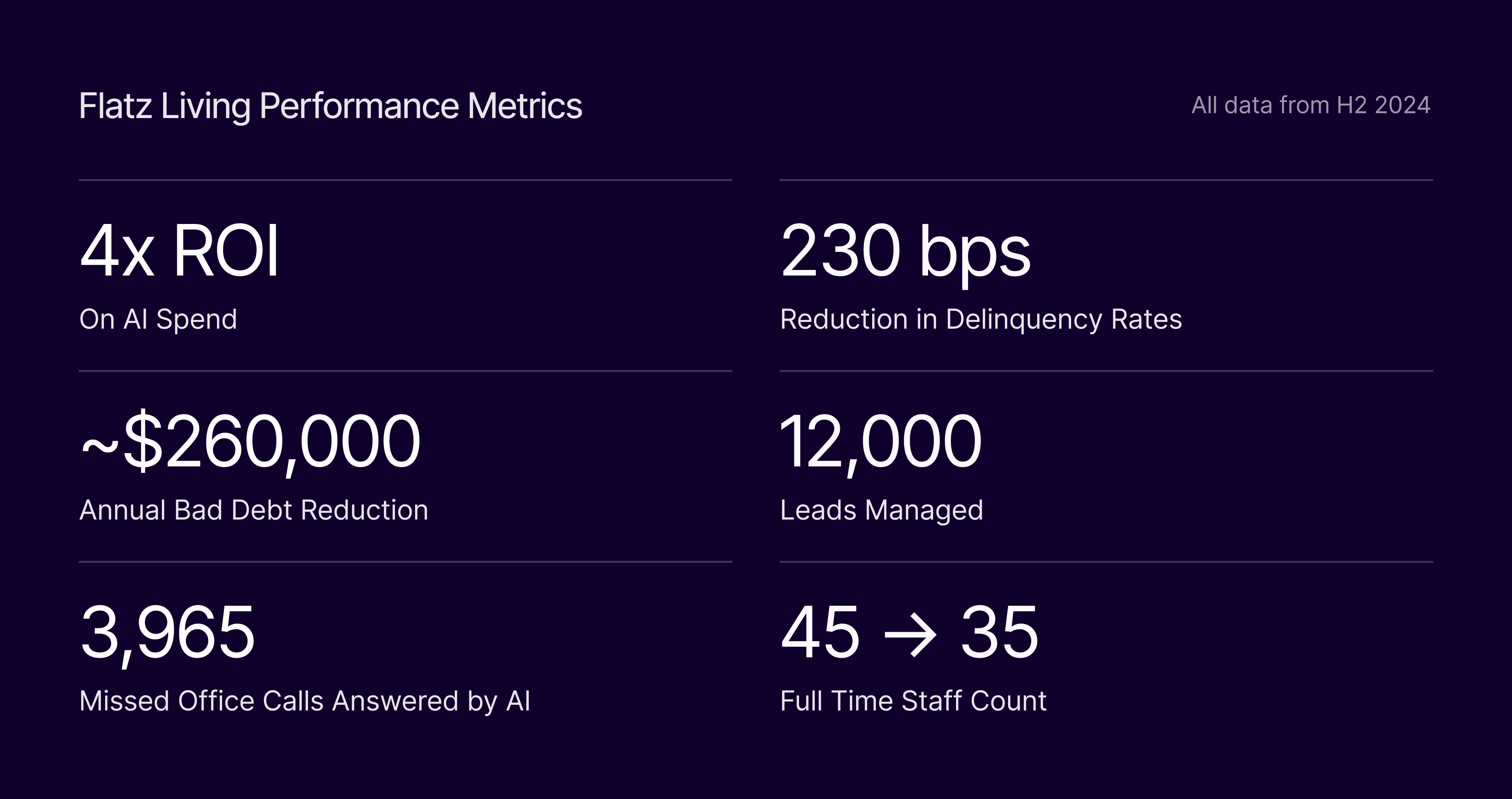 For Michigan-based owner/operator Flatz Living, operating lean without sacrificing service quality has been a key operational focus area for their team. By leveraging centralized collections support paired with EliseAI’s Delinquency product, they significantly reduced manual collections work and were able to staff their properties more efficiently. Overall, Flatz Living drove a 230bps reduction in portfolio-wide bad debt rates in H2 2024, resulting in ~$260,000 in annualized bad debt reduction—a significant sum for an owner/operator with just over 1,000 units.